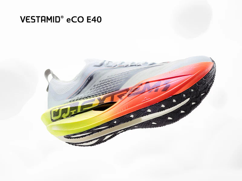 Midsole powered by VESTAMID® eCO E40—a lightweight, high-rebound PEBA foam crafted from recycled materials—delivers explosive propulsion, long-lasting cushioning, and reduced shoe weight, all while lowering environmental impact.
